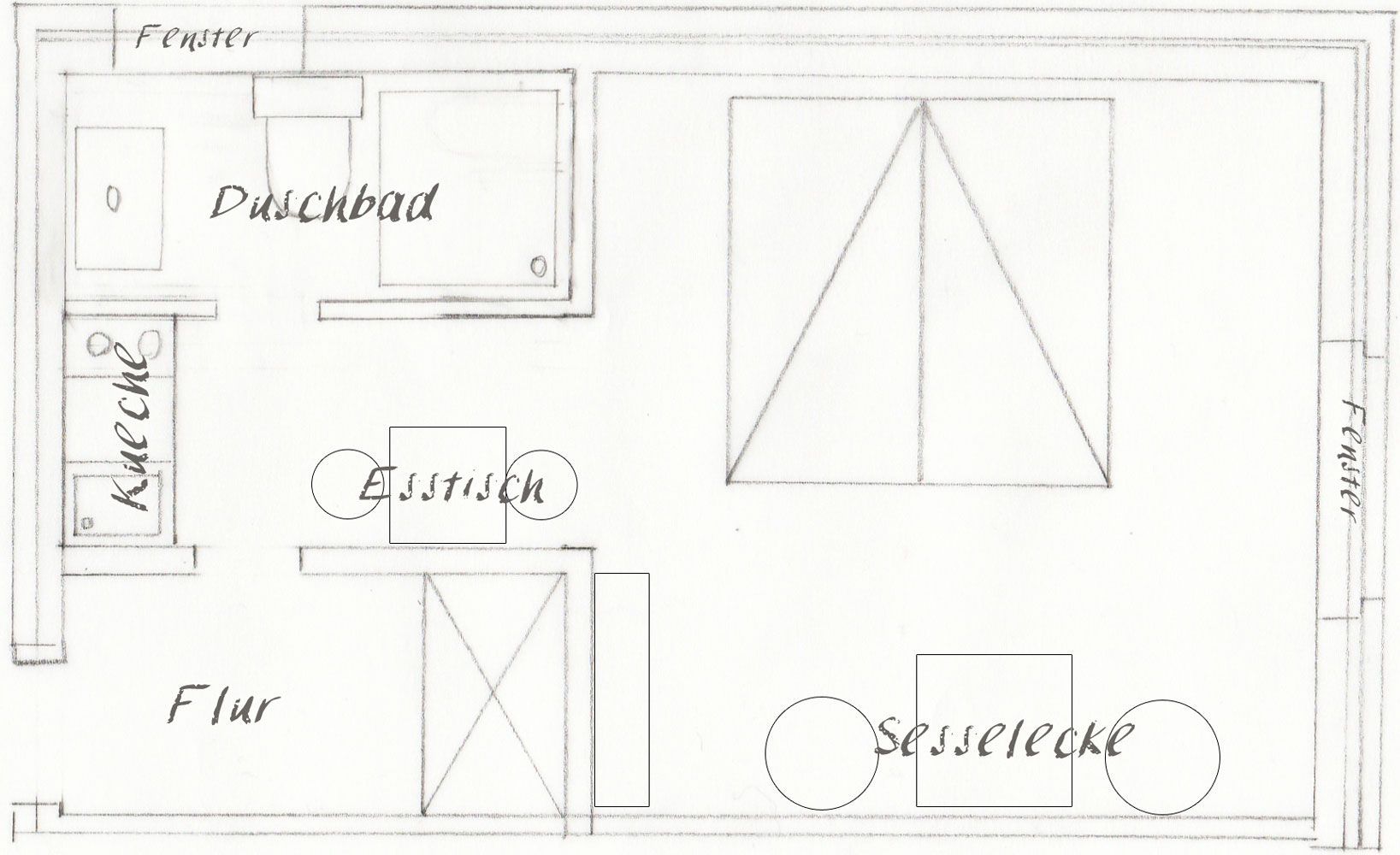Raumaufteilung: Wohn-Schlafbereich mit Pantryküche – praktisch und gemütlich zugleich.