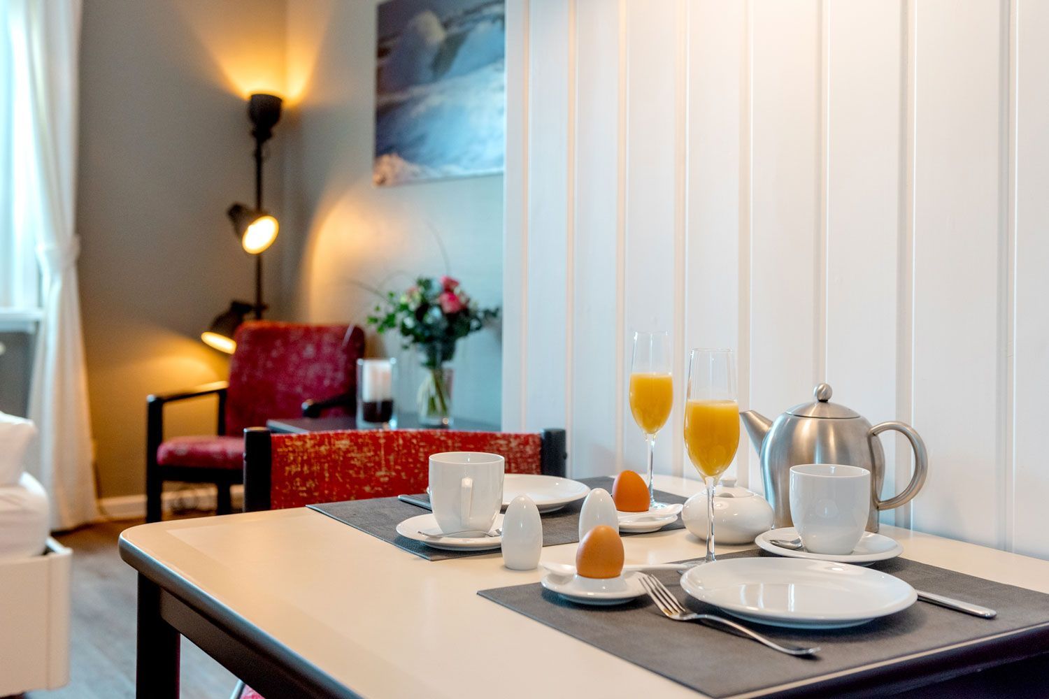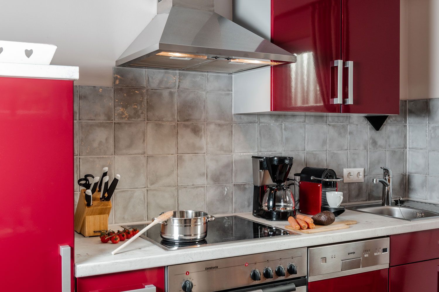 Diese 3-Zimmer-Wohnung befindet sich im sogenannten „Warftgeschoss“ – nur sieben Stufen führen dich hinunter ins Souterrain. Dank ebenerdiger Fenster und heller Einrichtung wirkt sie freundlich und einladend. Akzente in Rot sorgen für eine gemütliche Atmosphäre.