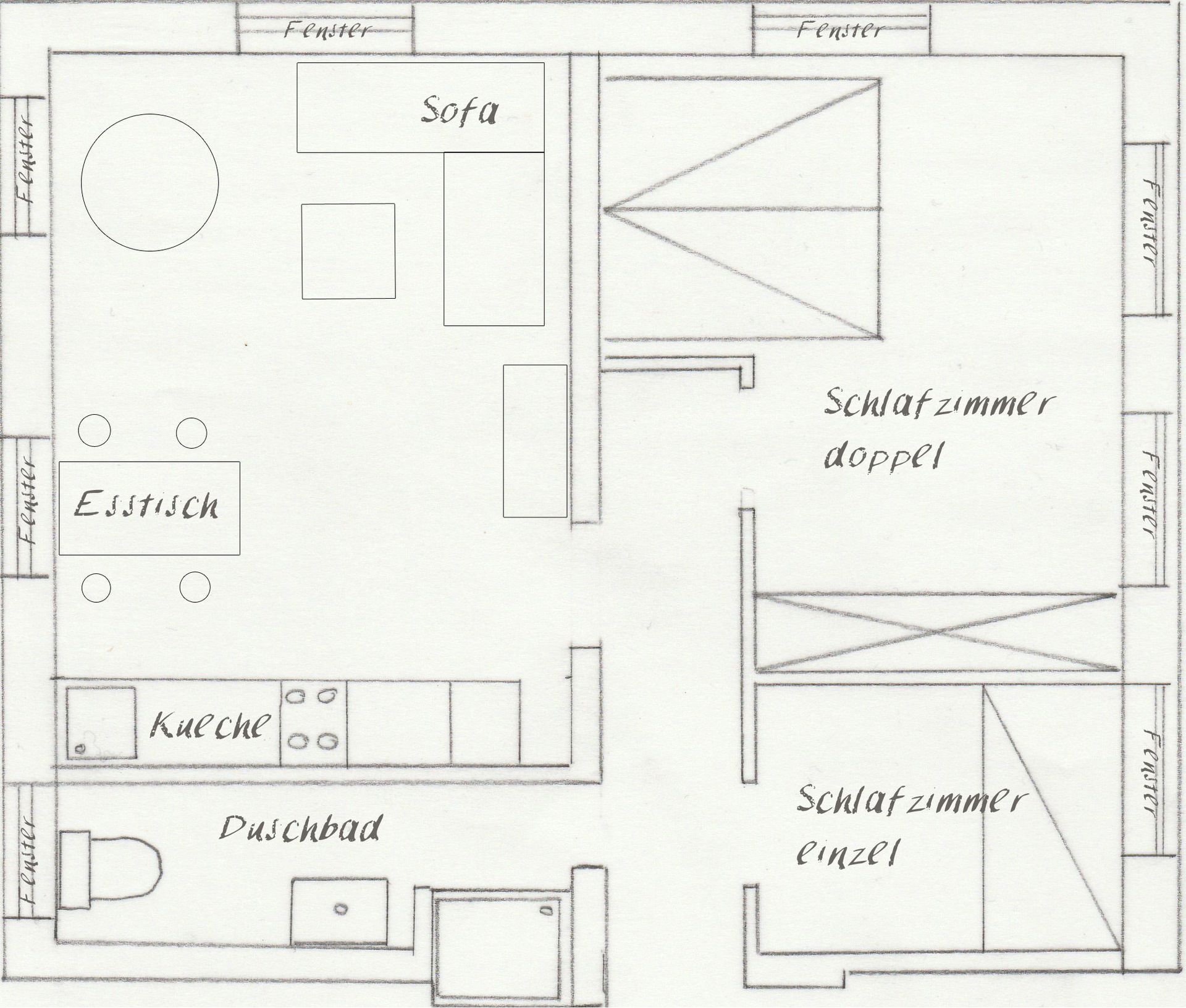 Raumaufteilung: Wohn-Schlafbereich mit Pantryküche – praktisch und gemütlich zugleich.
